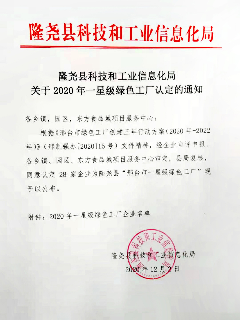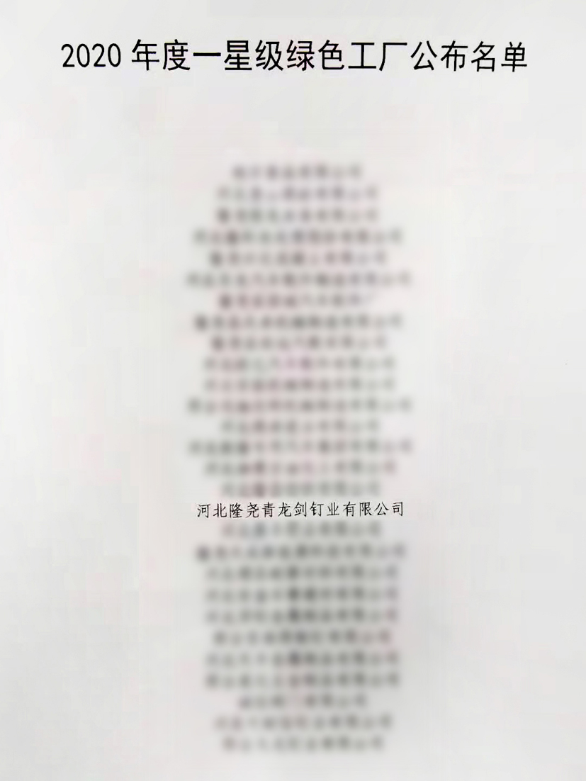 2020年12月2日,工信部印發(fā)根據(jù)《邢臺(tái)市綠色工廠創(chuàng)建三年行動(dòng)方案(2020年-2022年)》(邢制強(qiáng)辦【2020】15號(hào))文件精神,河北隆堯青龍劍釘業(yè)有限公司被評(píng)定為"邢臺(tái)市一星級(jí)綠色工廠"。