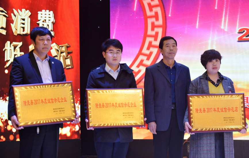會(huì)上,發(fā)布了消費(fèi)警示,質(zhì)量抽檢通報(bào),并對(duì)群眾投訴名單進(jìn)行了曝光。隨后對(duì)誠信經(jīng)營企業(yè)做出表彰。期間播放了青龍劍釘業(yè)宣傳片,并為企業(yè)頒發(fā)了“隆堯縣2017年度誠信示范企業(yè)”獎(jiǎng)牌。